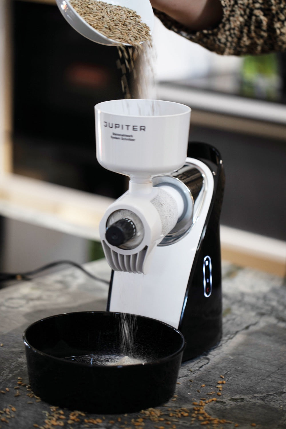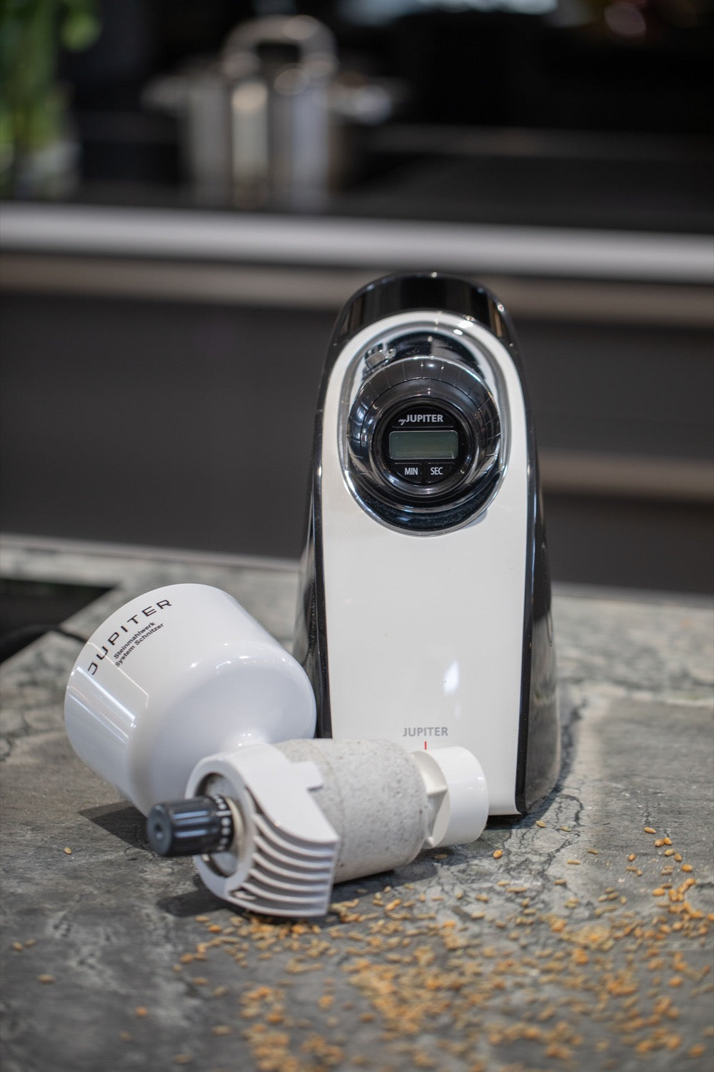 Jupiter Küchenmaschinen mySystem Getreidemühle mit Steinmahlwerk Kombi inklusive Systemantrieb (Motorblock) und steckbarem Timer